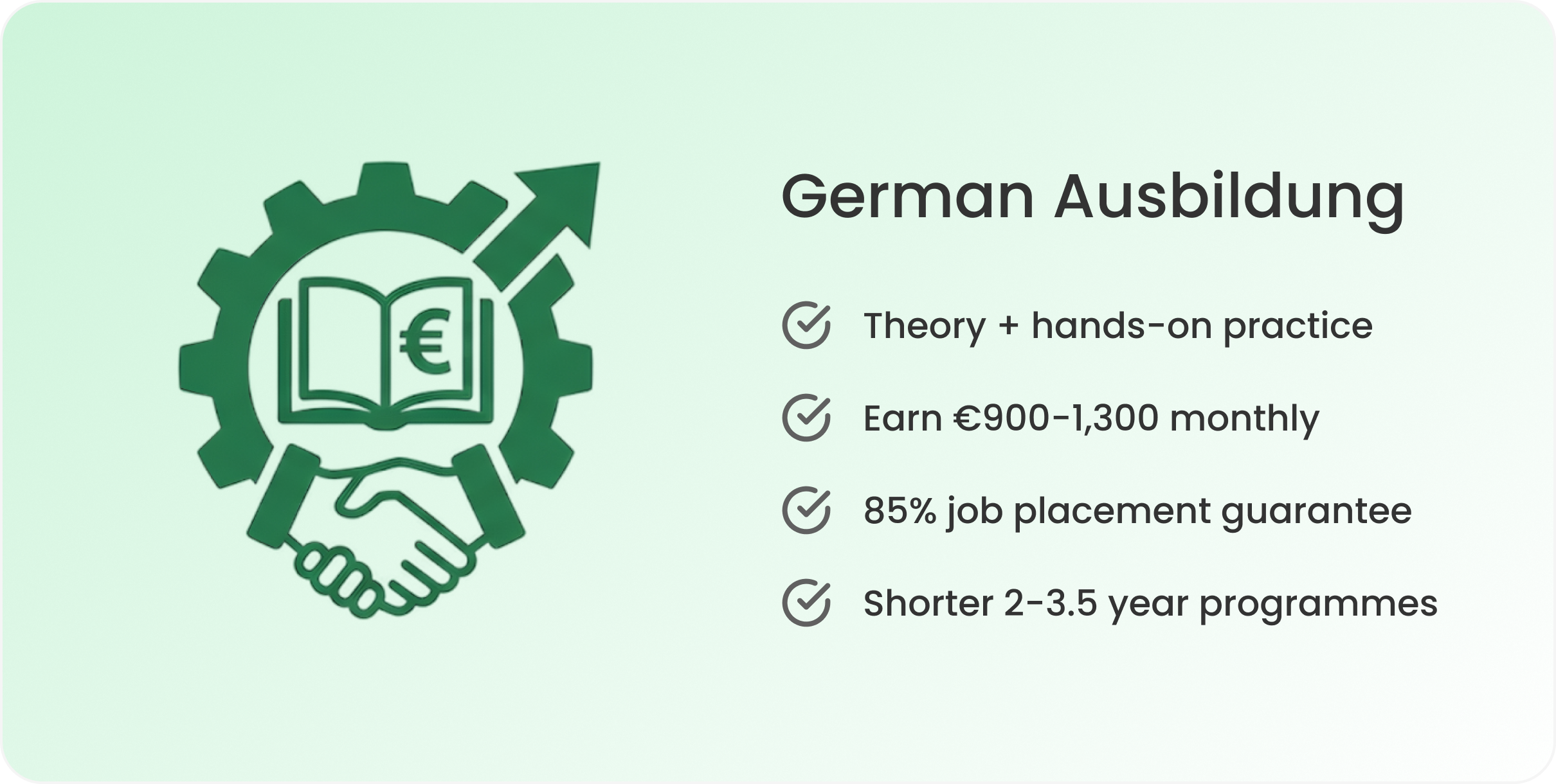 Ausbildung is a paid vocational training program in Germany that combines classroom education with on-the-job training. You earn a monthly stipend while gaining practical experience and a nationally recognized qualification.